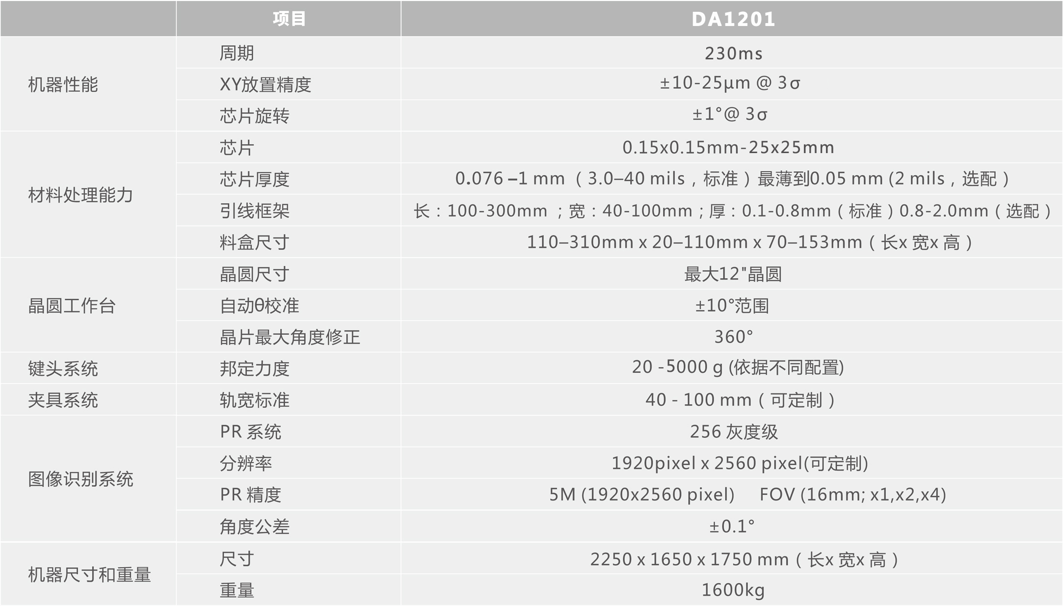 视觉识别系统 1920x2560分辨率; 256灰度级; 角度误差±0.1deg; 高智能的视觉系统,支持胶量,形状, 位置和固晶后等项目的自动检查。 |